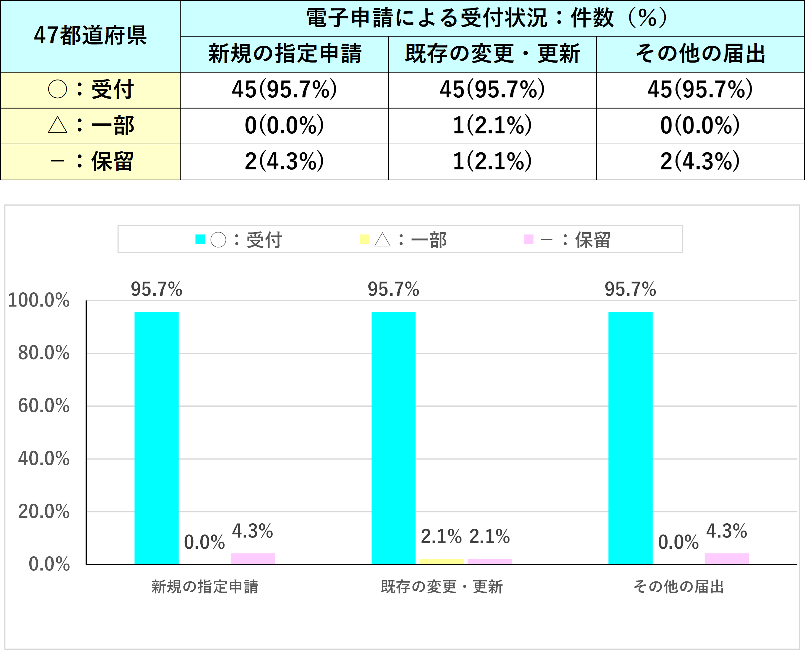 最新の受付状況では、ほぼ全数の都道府県で電子申請が開始されており、一部自治体で受付が一部/保留になっていますが、今年度中に電子申請での受付が予定されています。