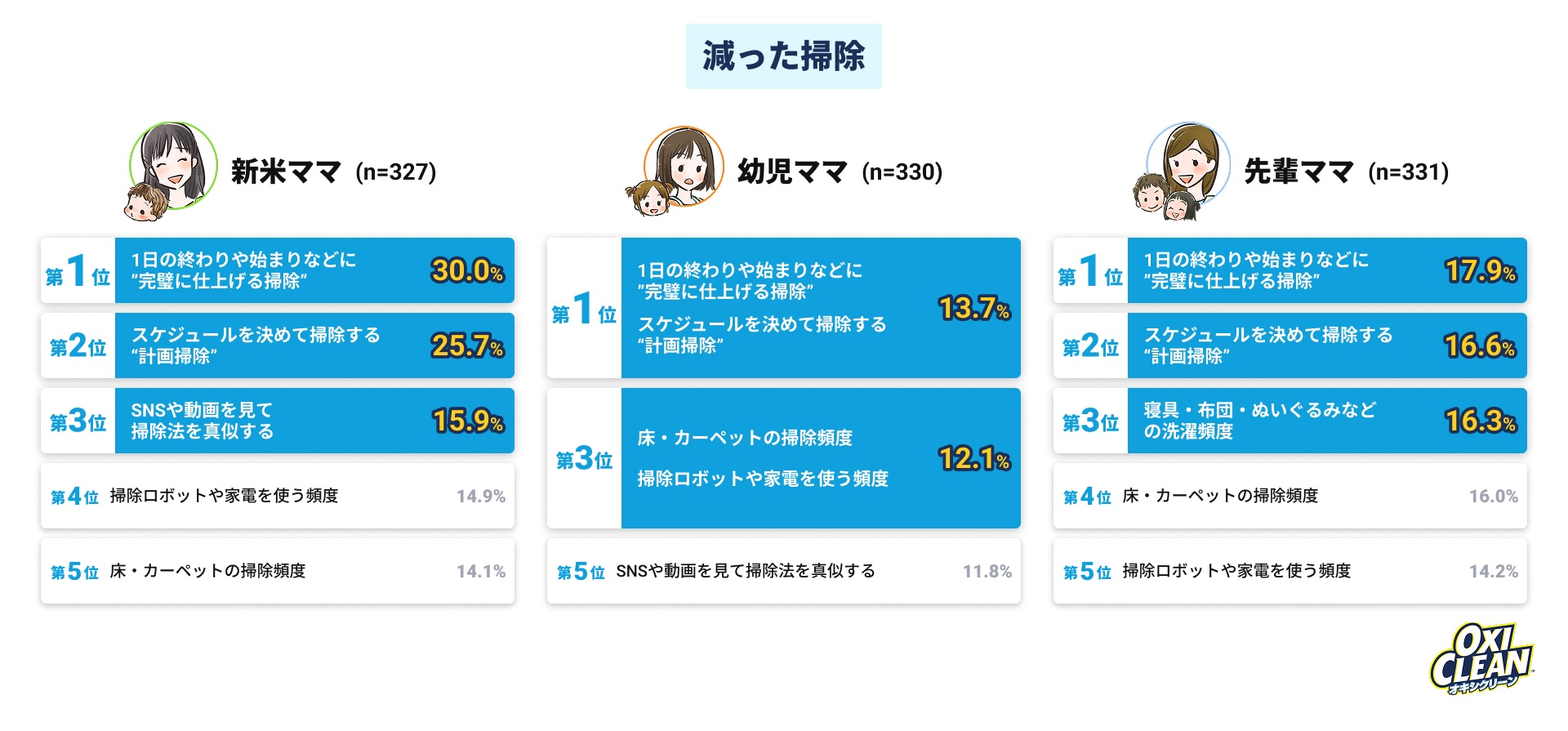 次に、育児ステージ別に「増えた掃除」と「減った掃除」についてたずねたところ、“完璧じゃなくていい”という価値観が実際の行動変化として定着しつつあることが明らかになりました。