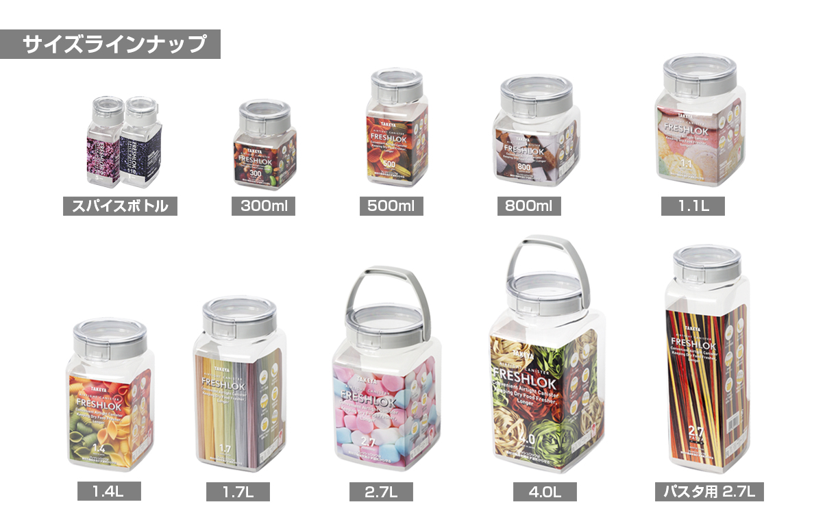 粉もの、乾物、スパイスなど、用途に合わせて多様なサイズをご用意。すでにお使いのフレッシュロックとも混在しやすいデザインです。