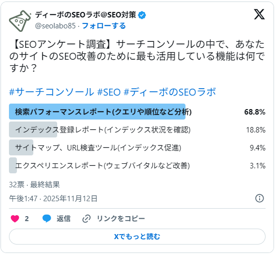 本調査は、ディーボが運営する「SEOラボ」の公式Xアカウント(@seolabo85)にて、2025年11月11日~12月2日の期間、「サーチコンソール」に関するアンケート調査を実施しました。