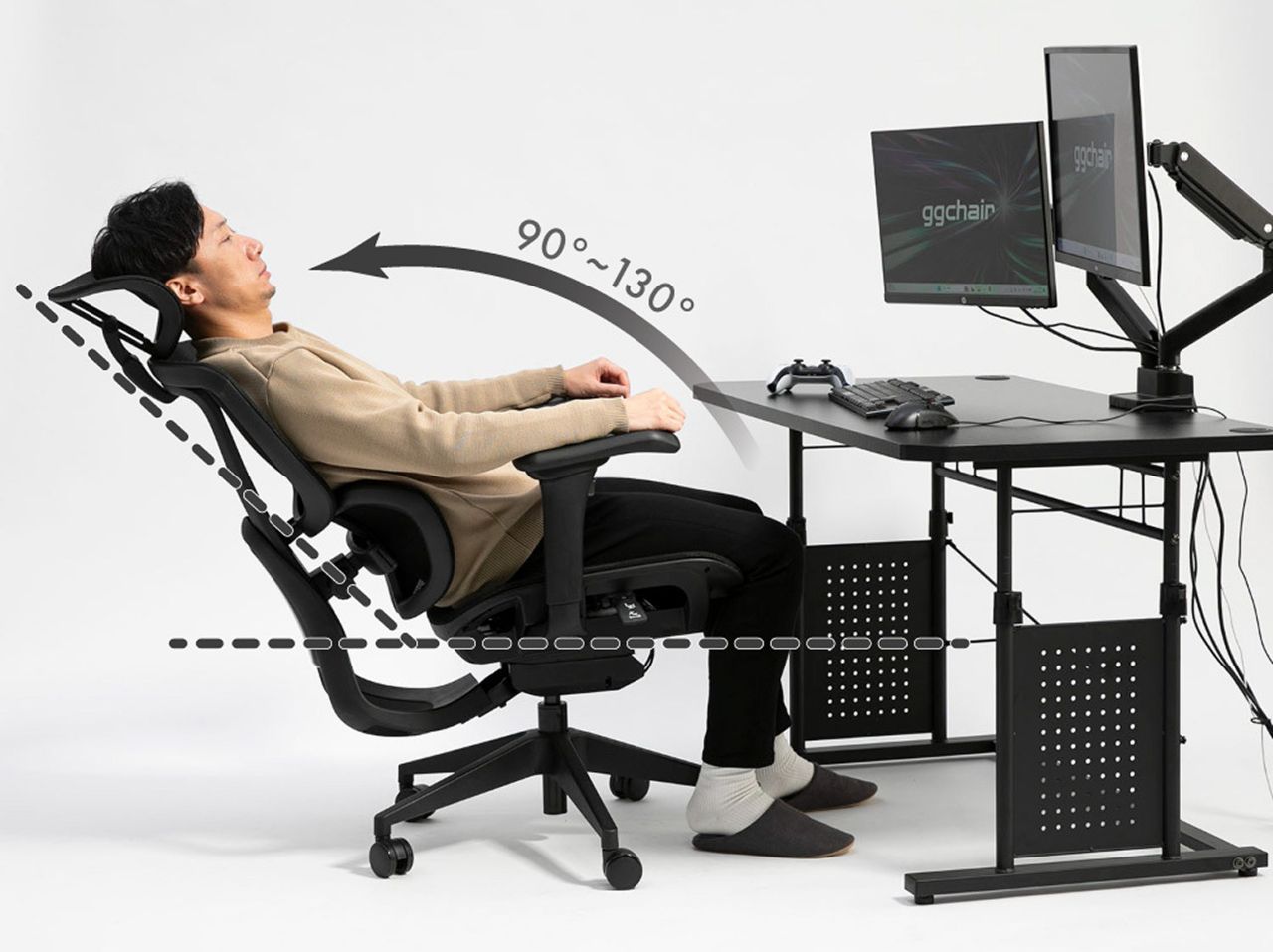 90〜130°の範囲で調節可能なリクライニング搭載。プレイの間の休憩時などに体を預け、ゆったりと座ることができます。背面も蒸れにくいメッシュ生地を使用しています。