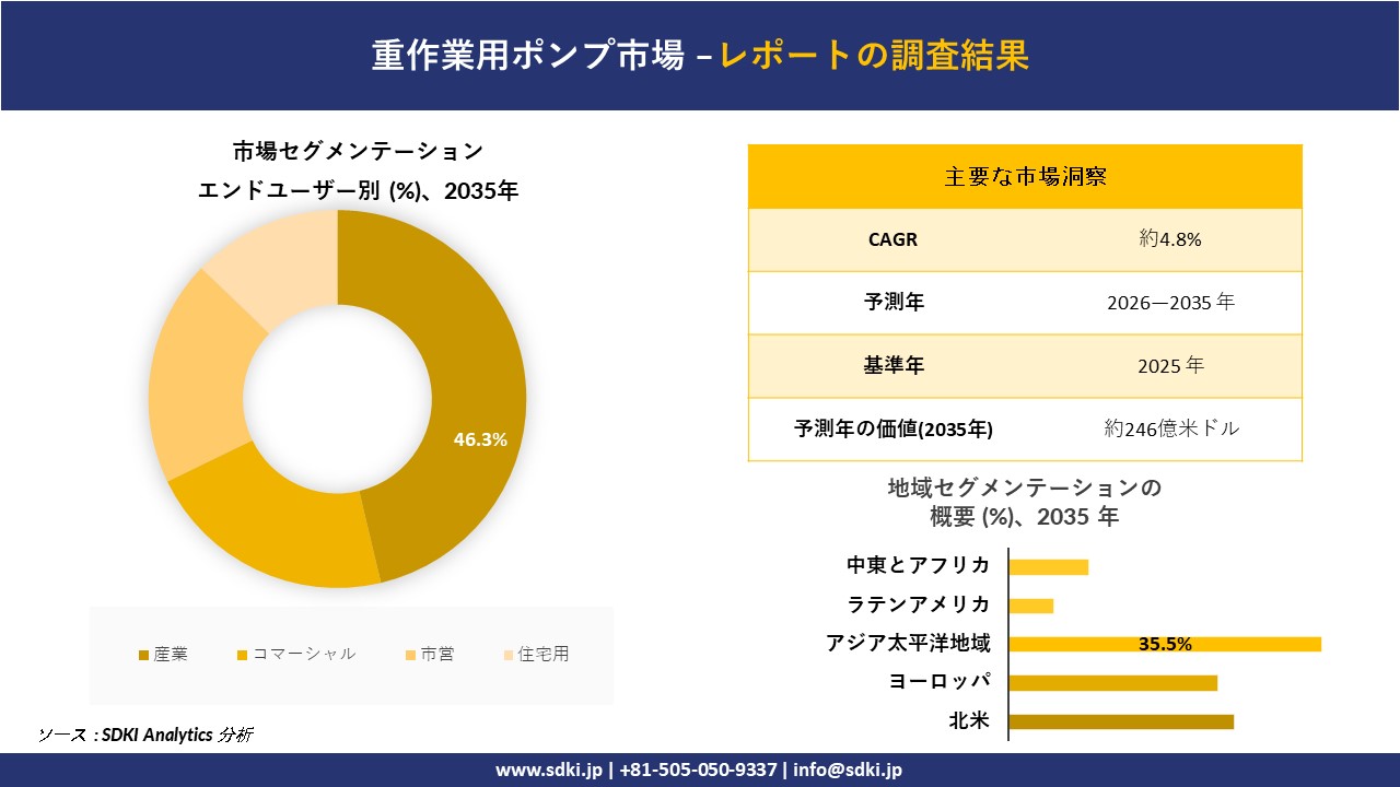 東京都渋谷区、2025年12月03:SDKI Analyticsはこのほど、「 重作業用ポンプ市場に関する調査レポート : 予測2026―2035年」を発行しました。調査レポートは、 重作業用ポンプ市場の成長に貢献する統計的および分析的アプローチに焦点を当てています。当社の読者は、現在の市場シナリオに関する明確なイメージを得るとともに、詳細な調査レポートで提供される主要な業界の洞察から将来の傾向についても理解します。重作業用ポンプ市場に関するこの調査レポートは、一次調査方法と二次調査方法の両方を利用して、市場の成長に伴う現在および将来の市場動向を分析します。