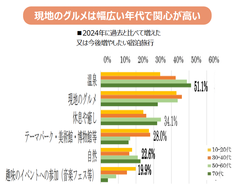 注目すべきは、旅行の目的です。2024年に最もしたい旅は「温泉」(45.1%)を抑え、「現地(ご当地)のグルメ」(51.1%)がトップとなりました。※3