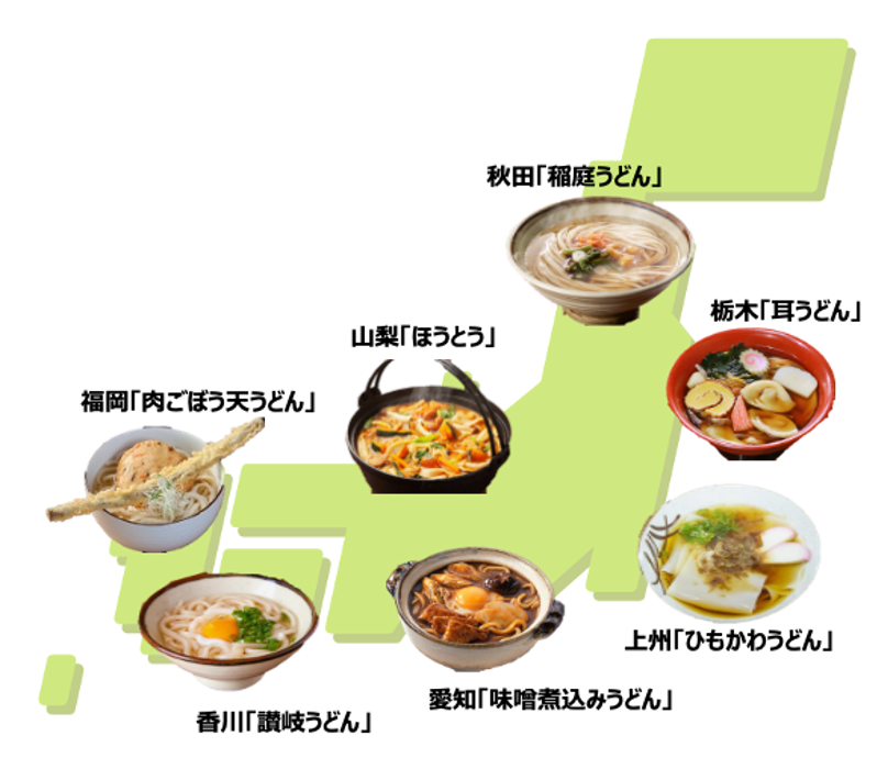 日本には秋田県「稲庭うどん」、栃木県の「耳うどん」、山梨県の「ほうとう」、 上州「ひもかわうどん」、愛知県の「味噌煮込みうどん」、香川県の「讃岐うどん」、 福岡県の「肉ごぼう天うどん」などなど国民に愛されるうどんには 各地域によって様々な特徴があります。 日本のソウルフードであるうどんを求め、 各地域でご当地うどんを楽しむ声もSNSで話題になっています。