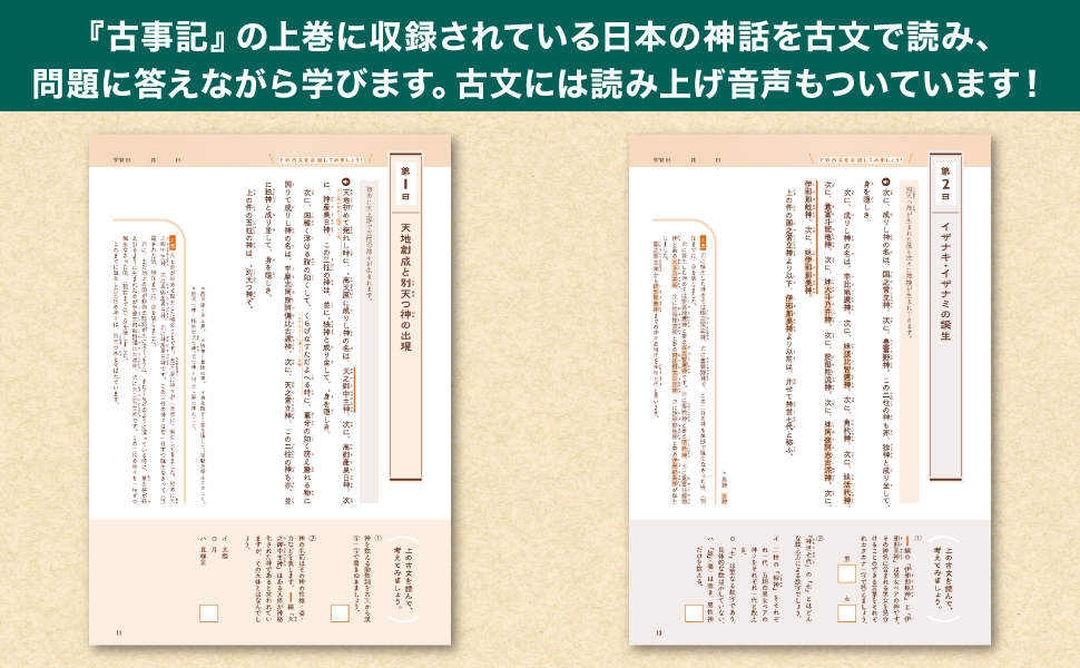 ・古文を黙読し、音読し、さらには付属の音声を聴いて、言葉の独特のリズムや神話の世界観を楽しめます。