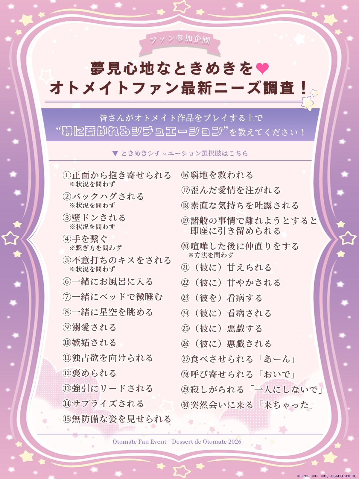 皆様には事前アンケートとしてスタッフ厳選のときめきシチュエーションを30個用意しておりますので、