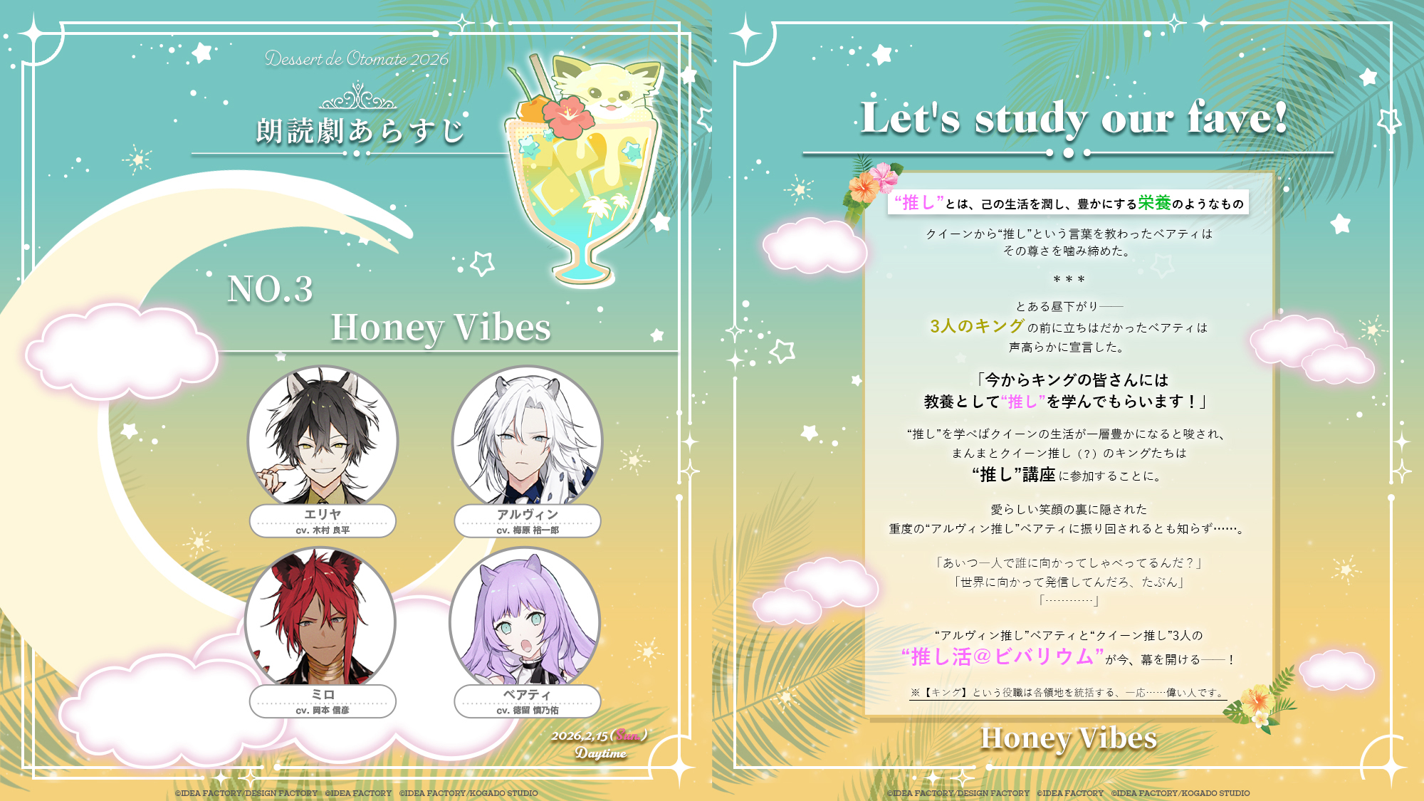 アイディアファクトリー株式会社(代表取締役社長:佐藤 嘉晃/所在地:東京都豊島区)の女性向けゲームブランド「オトメイト」は、2026年2月15日(日)開催予定のオトメイトファンイベント「Dessert de Otomate 2026」内のコーナーのひとつ「ファン参加企画」の回答受付を本日より開始いたしました。