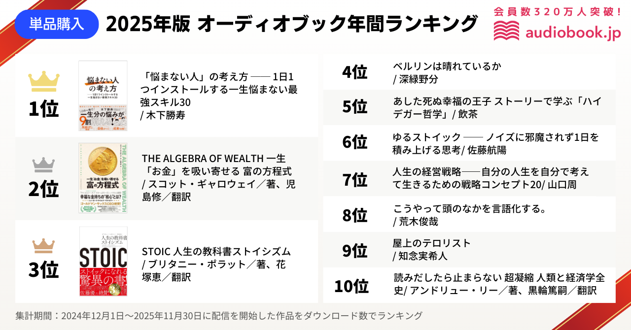 「audiobook.jp」におけるオーディオブック作品のダウンロード数または再生ユニークユーザー数をもとに順位付けした、2025年(2024年12月1日〜2025年11月30日)の「単品購入」と「聴き放題」の人気ランキング トップ10を発表します。