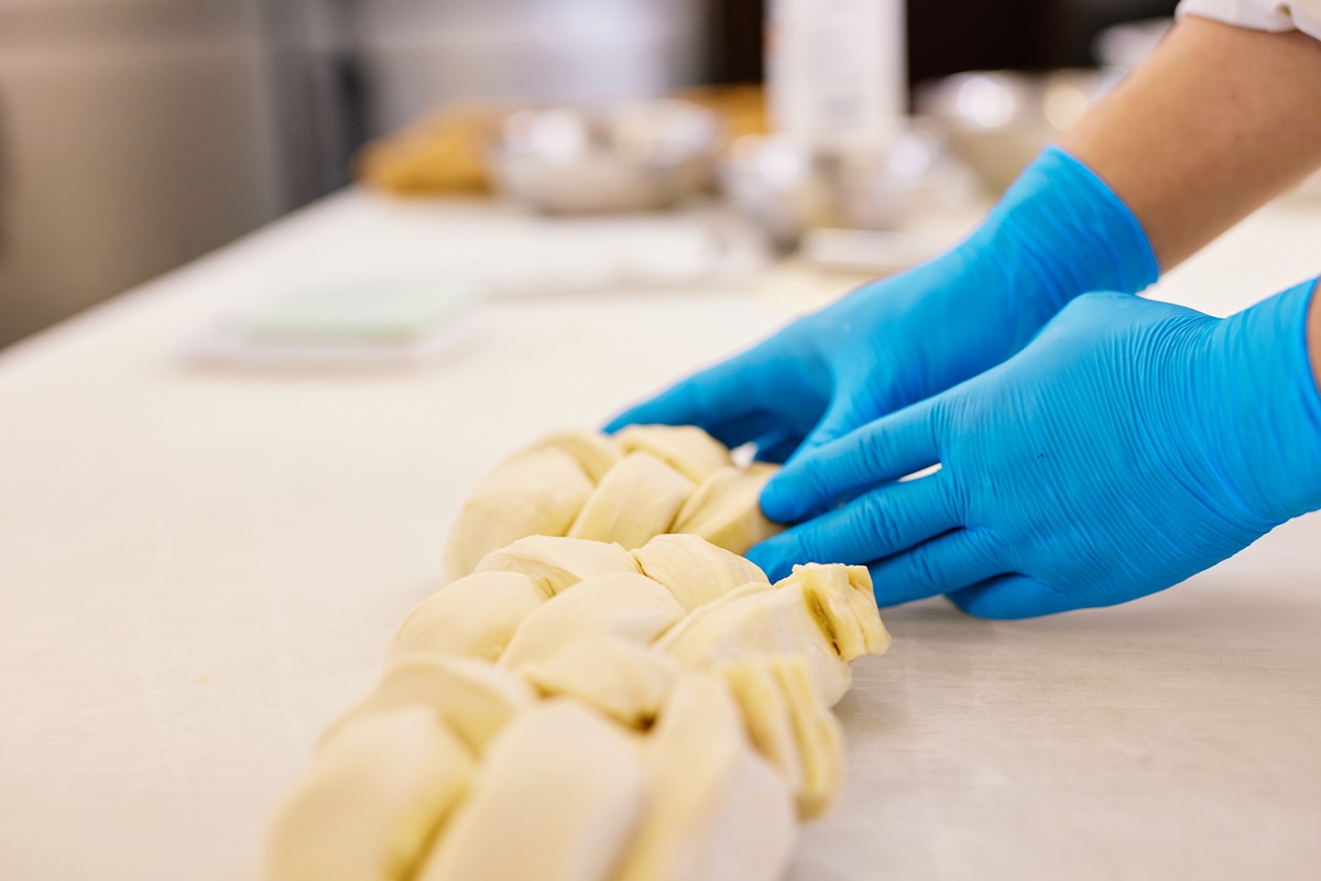 キューブ型の可愛いらしいデニッシュパンをカットした断面を見てみると、生地とバターの層が美しいマーブル模様になっています。これは、何度も折りたたみ何層にも重なった生地を、三つ編み状に編み込んで焼型に入れるためです。