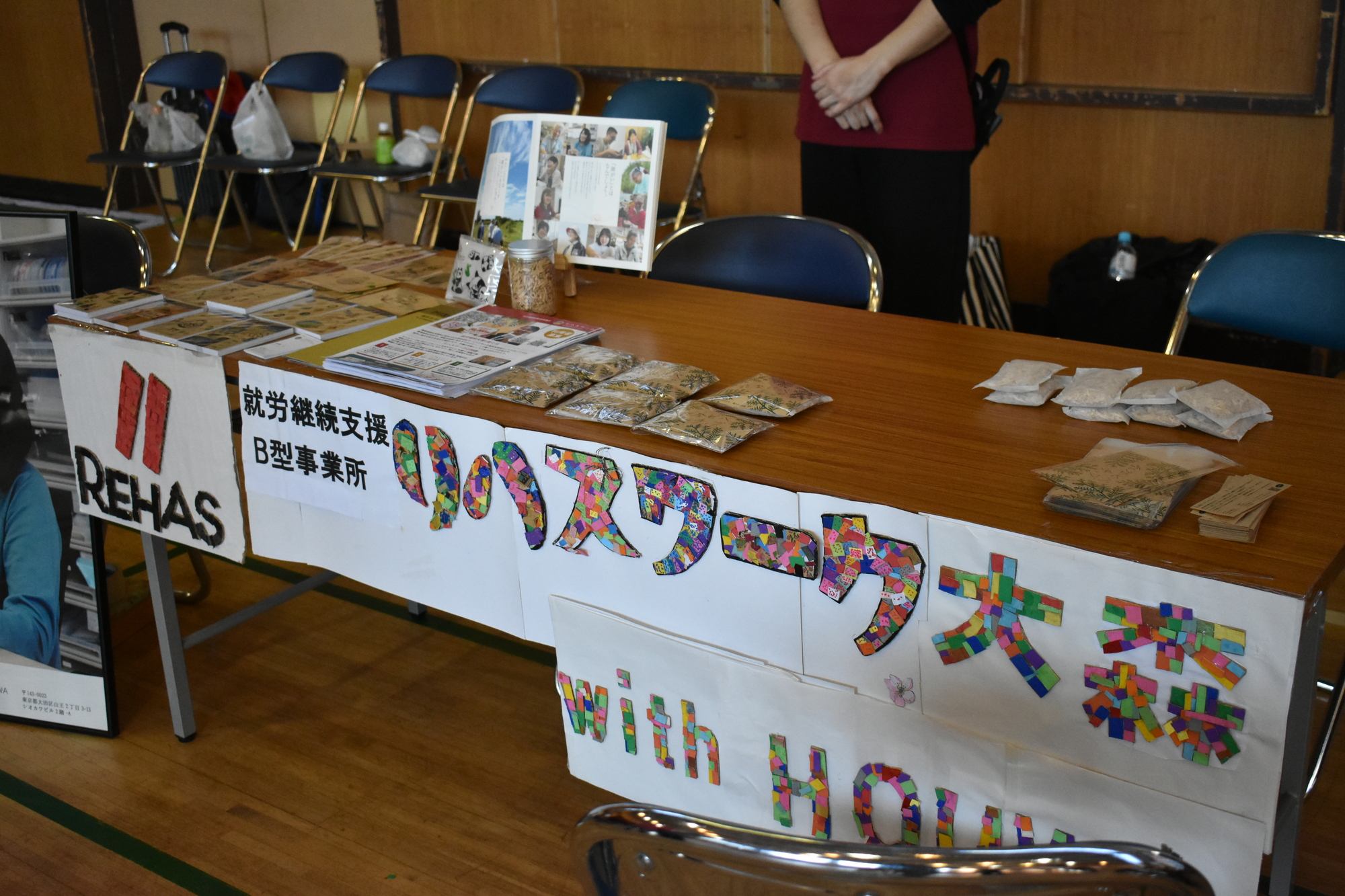 地域の障がい者就労支援施設の商品販売(ハンドメイド小物など) 、地域の方々による飲食販売(お弁当やお惣菜)、スープ屋さんtaptapによるスープ、たい焼き、ドリンク販売。