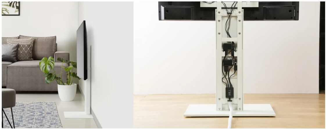 賃貸でも壁を傷つけずに壁掛け風にテレビを設置できるため、すっきりした空間を実現します。テレビ周りの配線を支柱の裏に隠すことで、生活感のある「ごちゃつき」を一掃。