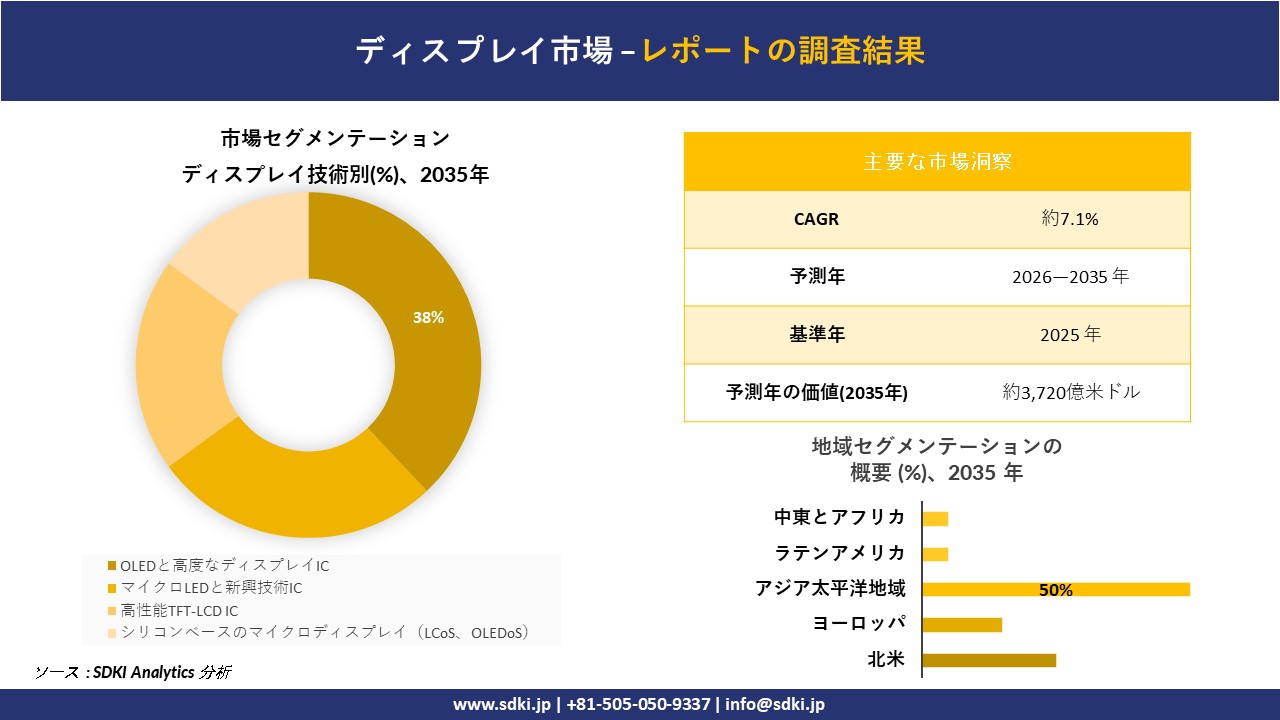 東京都渋谷区、2025年12月08:SDKI Analyticsはこのほど、「 ディスプレイ市場に関する調査レポート : 予測2026―2035年」を発行しました。調査レポートは、 ディスプレイ市場の成長に貢献する統計的および分析的アプローチに焦点を当てています。当社の読者は、現在の市場シナリオに関する明確なイメージを得るとともに、詳細な調査レポートで提供される主要な業界の洞察から将来の傾向についても理解します。ディスプレイ市場に関するこの調査レポートは、一次調査方法と二次調査方法の両方を利用して、市場の成長に伴う現在および将来の市場動向を分析します。