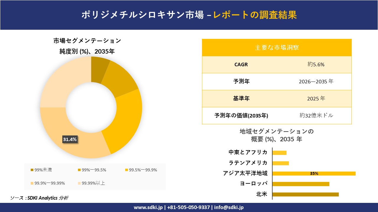 東京都渋谷区、2025年12月08:SDKI Analyticsはこのほど、「 ポリジメチルシロキサン市場に関する調査レポート : 予測2026―2035年」を発行しました。調査レポートは、 ポリジメチルシロキサン市場の成長に貢献する統計的および分析的アプローチに焦点を当てています。当社の読者は、現在の市場シナリオに関する明確なイメージを得るとともに、詳細な調査レポートで提供される主要な業界の洞察から将来の傾向についても理解します。ポリジメチルシロキサン市場に関するこの調査レポートは、一次調査方法と二次調査方法の両方を利用して、市場の成長に伴う現在および将来の市場動向を分析します。