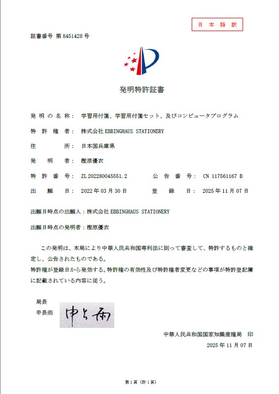学習の復習計画を見える化する文具ツール「エビングハウスフセン」は、このたび中国において特許を取得したことをお知らせします。これに伴い、中国本土での販売アライアンス(代理店・卸・共同開発パートナー)募集を本格的に開始します。