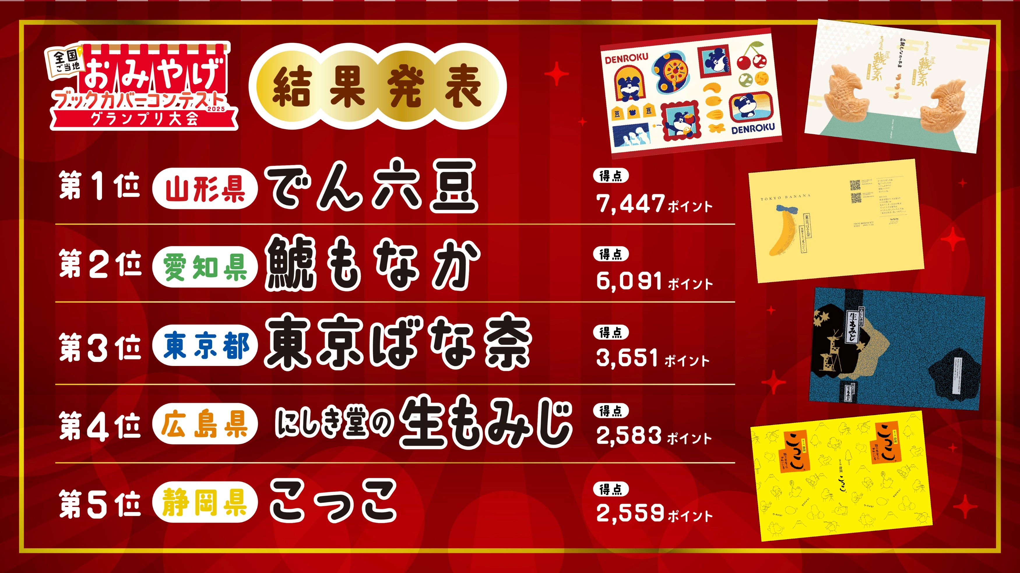 - 集計の結果、総合優勝は北海道・東北ブロック代表の山形県「でん六豆」に決定、またSNS投票では東海・近畿ブロック代表の愛知県「鯱もなか」が得票数1位となりました。