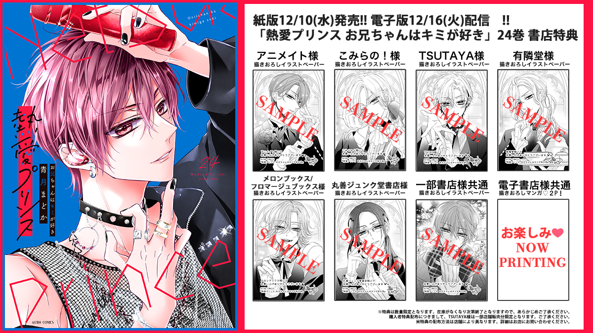 株式会社 宙出版(本社:東京都千代田区、代表取締役社長:大宮敏靖)は、累計250万部を突破した『熱愛プリンス お兄ちゃんはキミが好き』(著:青月まどか)最新24巻を、2025年12月10日(水)にASTRO COMICSより発売いたします。電子版は12月16日(火)より配信開始。 紙版・電子版それぞれに、人気声優・KENNさんの約3分の特典ボイスを収録(※内容は異なります)。 連載10周年を迎える大人気作の最新巻です。