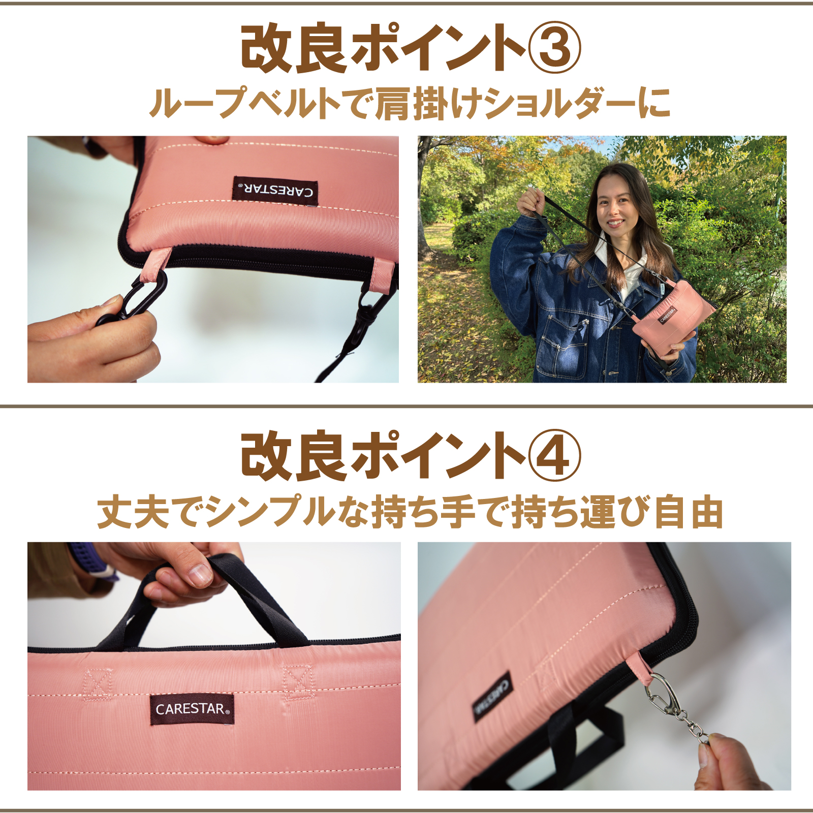 第一弾蓄熱ポータブルクッションからの改良でアップグレードした、ベルトやハンドルがついた持ち運べるバッグ型クッションでより便利に。
