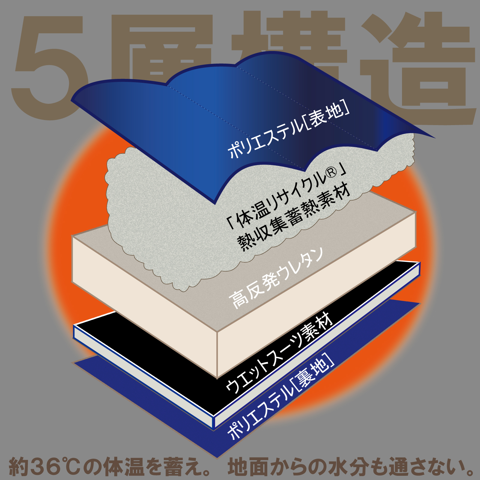 人体の熱を吸収して蓄える特殊中綿をふんだんに使用。5層構造で地面からの冷気も通さない、あたたかさにこだわった構造。