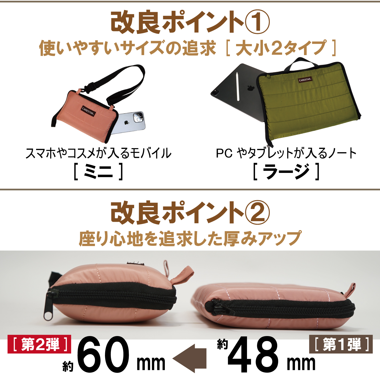 第一弾「蓄熱ポータブルクッション」でのご購入者様のお声を反映しグレードアップした仕様かつ2サイズ展開。