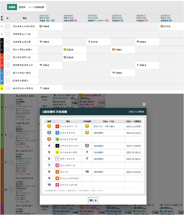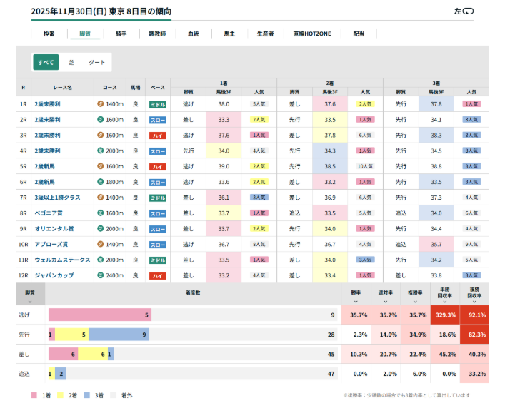 当日のレース結果をリアルタイムで反映し、3着以内に入線した馬の枠番、脚質、騎手、通過位置などの情報を一覧表示。当日のレース傾向を一目で把握できます。
