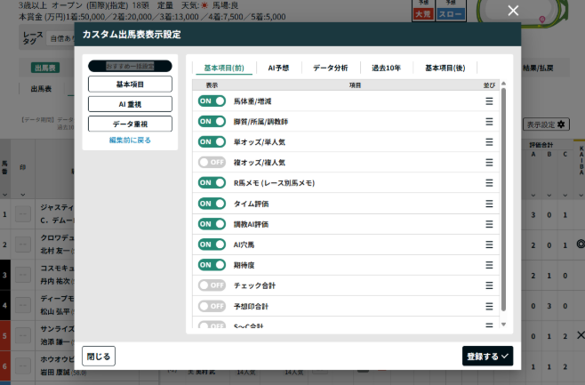ユーザー自身が見たい情報を自由に選択、並び替えできる、自分好みにカスタマイズ可能な出馬表です。データ分析ページからユーザーが注目した条件項目を追加することも可能になりました。