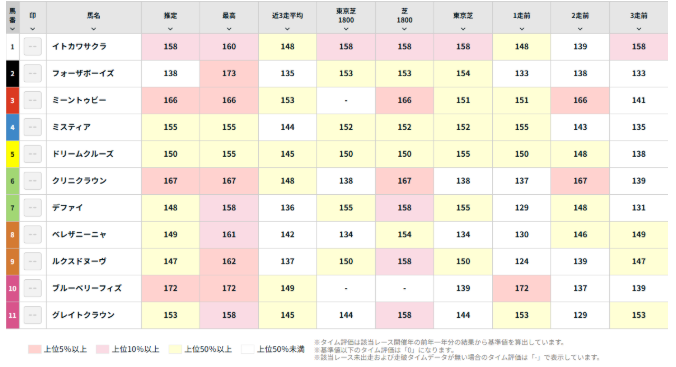 「走破タイム」とレース当日の「タイムの出やすさ」をもとにした独自指標です。異なる競馬場・距離・馬場状態であっても、横並びで比較が可能な「走破タイムの真の価値」をスコアで表示しています。