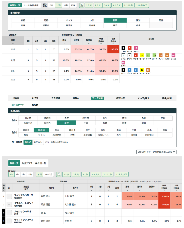 出走馬着度数一覧、対戦成績、持ちタイム一覧、勝ち上がり表、過去10年データ、データ分析機能など豊富な目的別データの追加と、各ページでの細かい条件絞り込みにより、目的の情報に素早く辿りつける使い勝手を実現しました。