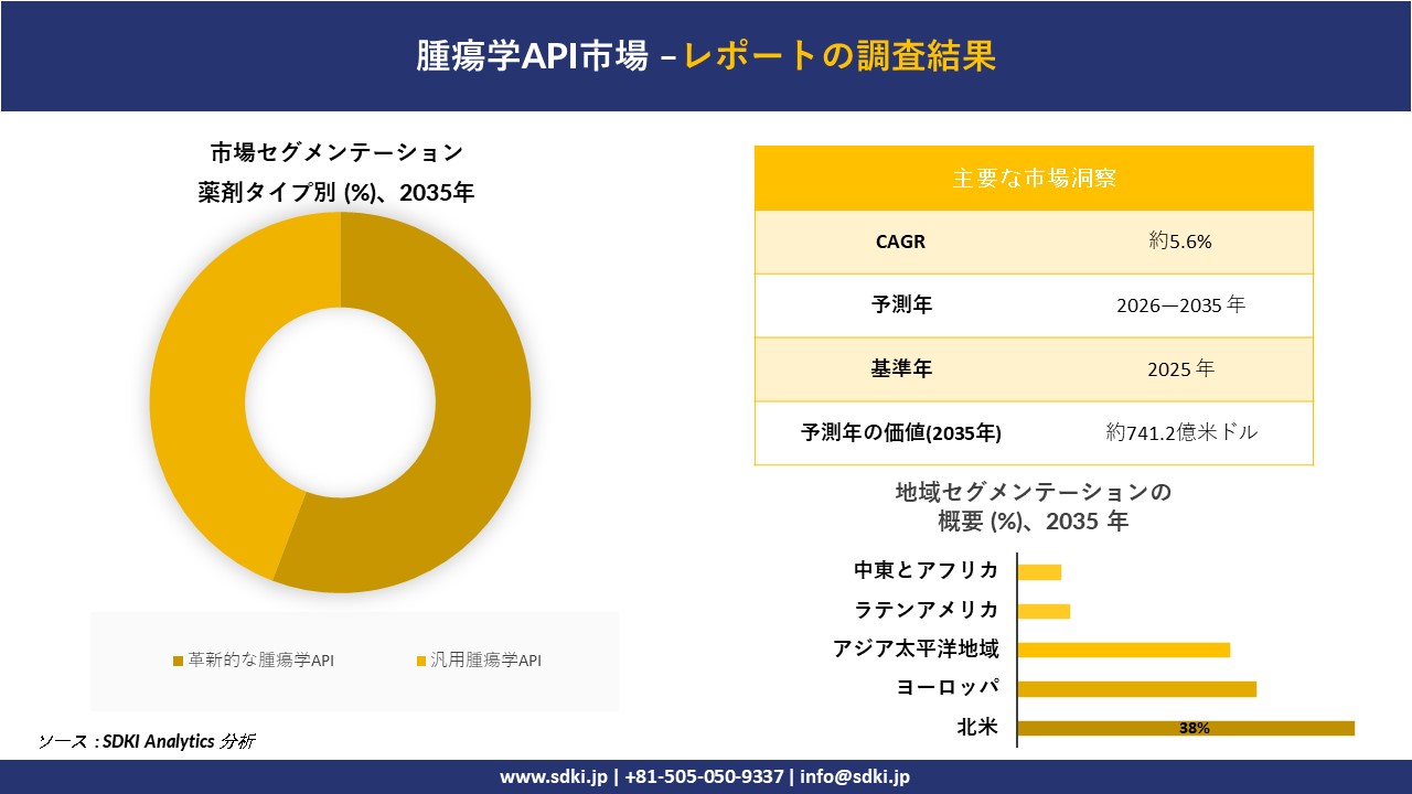 東京都渋谷区、2025年12月10:SDKI Analyticsはこのほど、「 腫瘍学API市場に関する調査レポート : 予測2026―2035年」を発行しました。調査レポートは、 腫瘍学API市場の成長に貢献する統計的および分析的アプローチに焦点を当てています。当社の読者は、現在の市場シナリオに関する明確なイメージを得るとともに、詳細な調査レポートで提供される主要な業界の洞察から将来の傾向についても理解します。腫瘍学API市場に関するこの調査レポートは、一次調査方法と二次調査方法の両方を利用して、市場の成長に伴う現在および将来の市場動向を分析します。