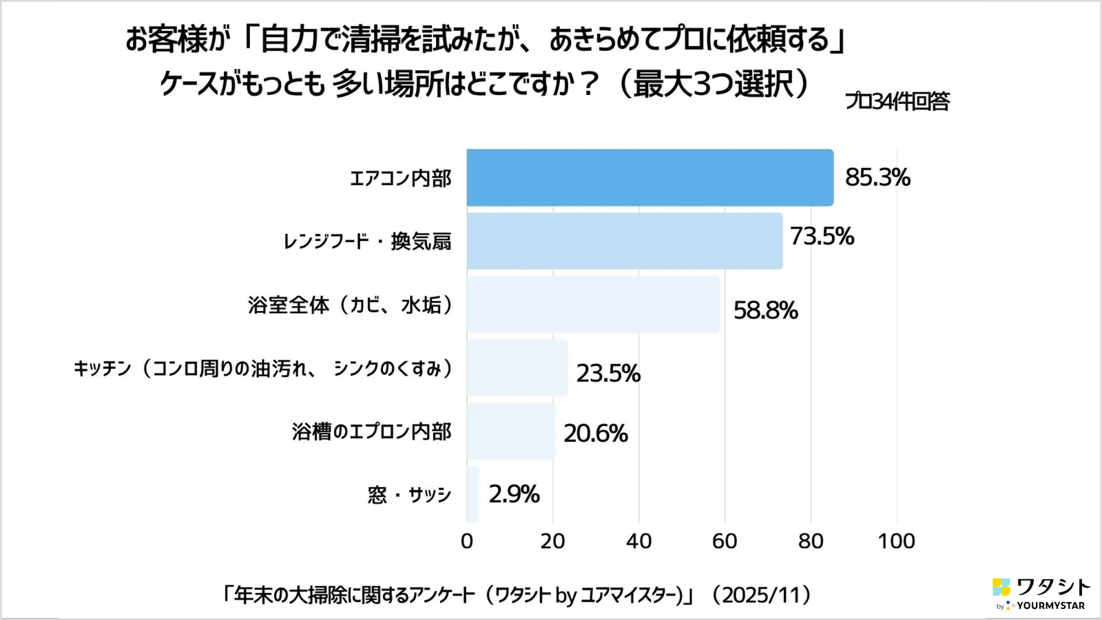 もっとも多かったのは「エアコン内部」で、85.3%のプロが「途中で諦めて依頼されるケースが多い」と回答しました。続いて「レンジフード・換気扇」(73.5%)、「浴室全体(カビ・水垢)」(58.8%)と、汚れが蓄積しやすく構造が複雑な場所が上位を占める結果となりました。