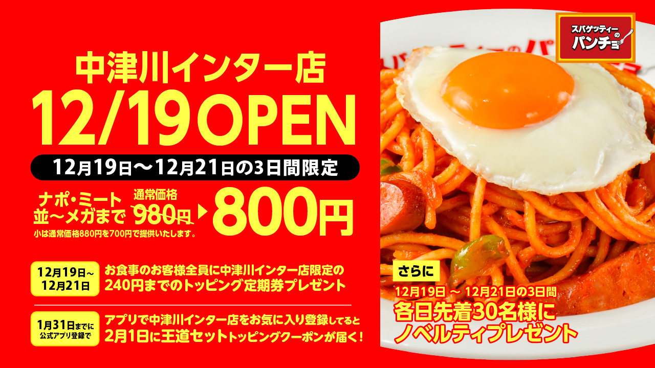 ナポリタン専門店「スパゲッティーのパンチョ 中津川インター店」が12月19日(金)新規開店、3連続オープニングキャンペーンを開催!