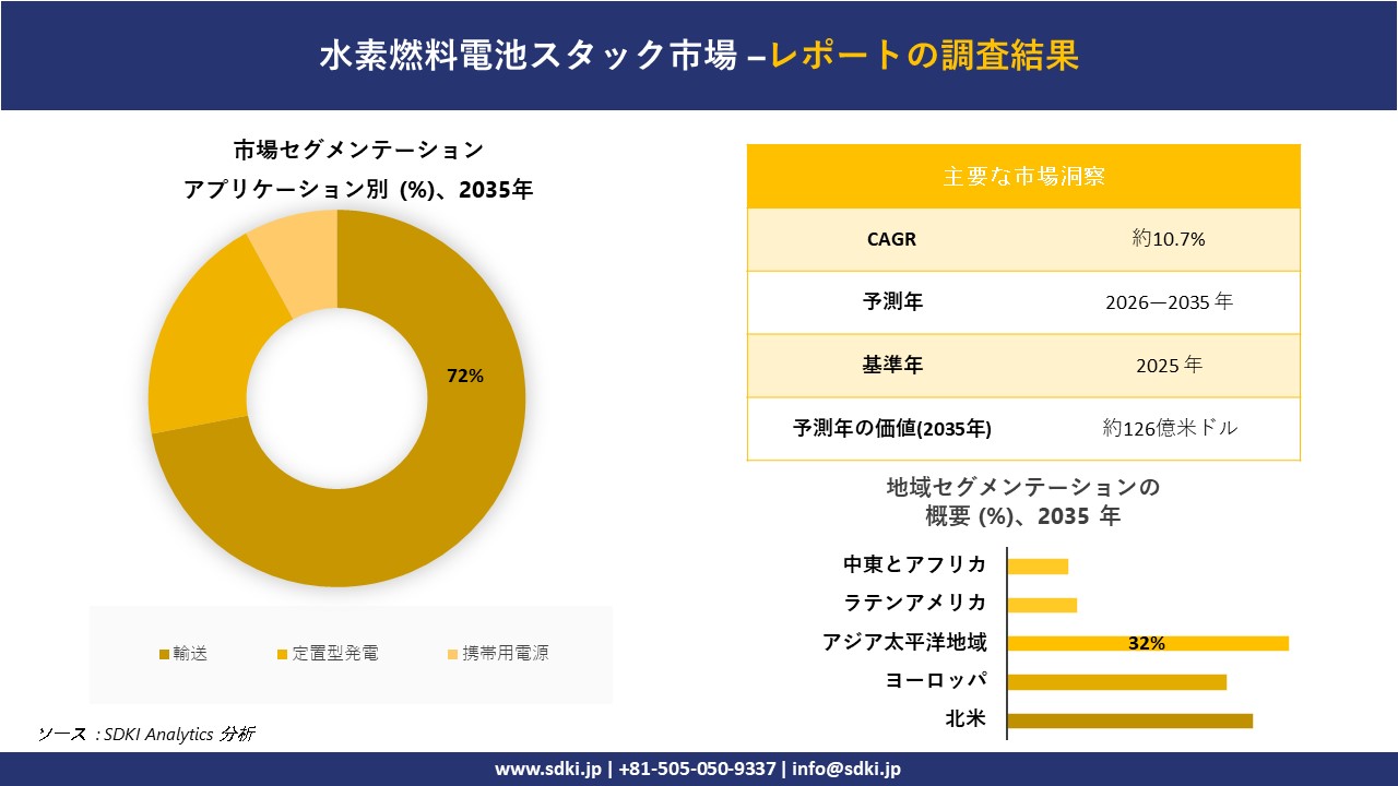 東京都渋谷区、2025年12月12日:SDKI Analyticsはこのほど、「 水素燃料電池スタックに関する調査レポート : 予測2026―2035年」を発行しました。調査レポートは、 水素燃料電池スタックの成長に貢献する統計的および分析的アプローチに焦点を当てています。当社の読者は、現在の市場シナリオに関する明確なイメージを得るとともに、詳細な調査レポートで提供される主要な業界の洞察から将来の傾向についても理解します。水素燃料電池スタックに関するこの調査レポートは、一次調査方法と二次調査方法の両方を利用して、市場の成長に伴う現在および将来の市場動向を分析します。
