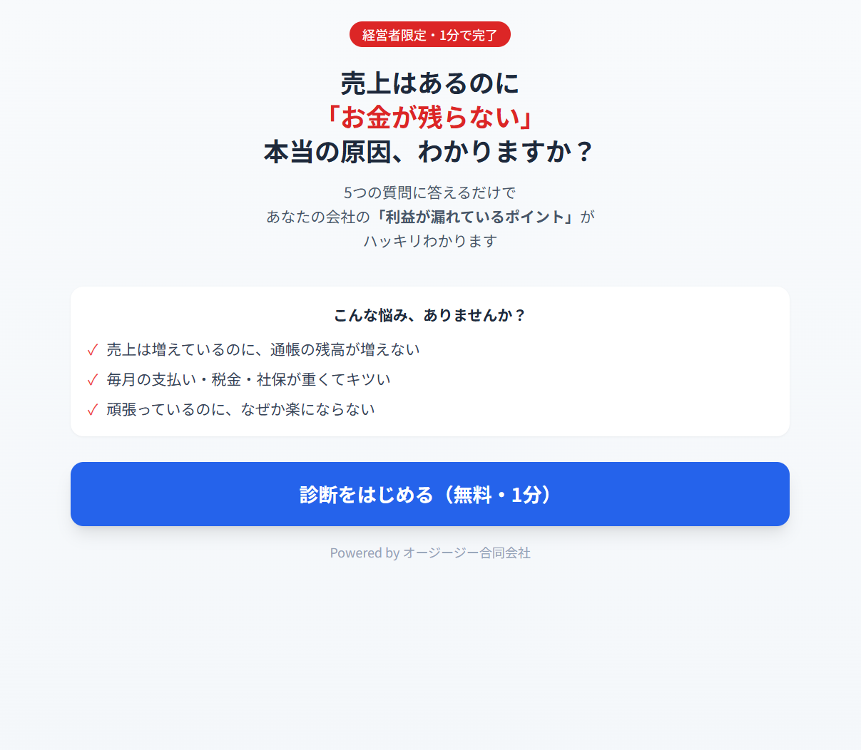 オージージー合同会社(本社:東京都渋谷区、代表:高野容一)は、中小企業経営者向けに、売上・利益・手元資金の状態を簡易的に整理できる無料診断ツール「経営の『お金が残らない原因』診断」を公開しました。