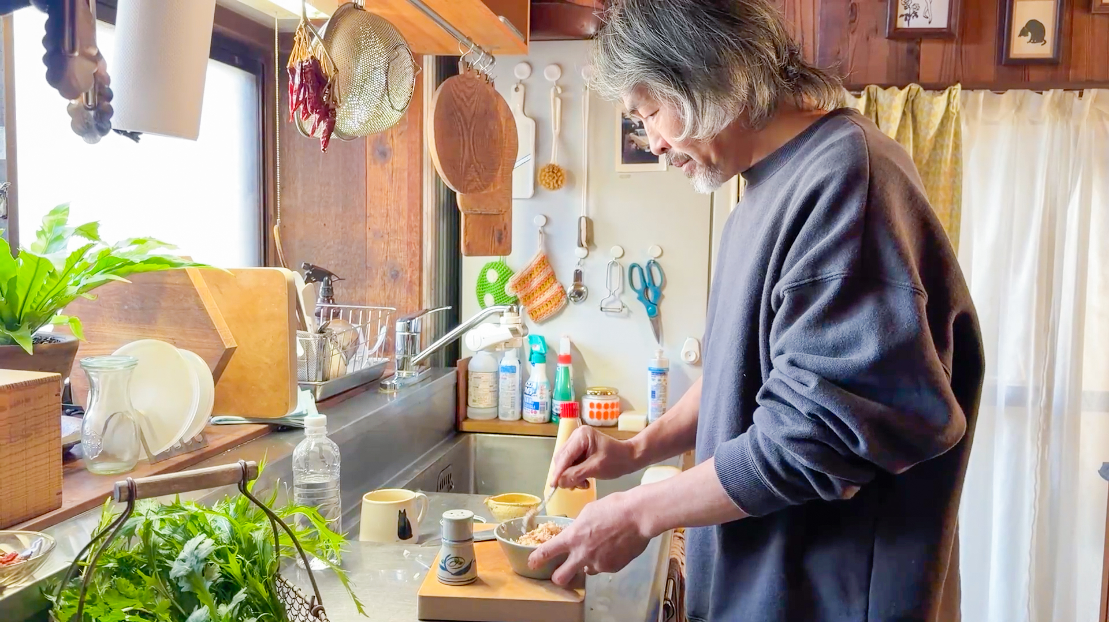 そんな本作に、木工家の本田淳が登場しました。庭で採れた水菜や春菊、みかんを収穫し、制作過程で出た端材を薪にしたストーブで湯を沸かすところから一日が始まります。豆から丁寧に淹れるコーヒーとともに、ツナと玉ねぎ、春菊を挟んだホットサンド、水菜のサラダ、夏に仕込んだ自家製ブルーベリージャムのヨーグルトを用意。匙や皿、さらには椅子やテーブルまでも自作という、木工家ならではの朝の風景です。薪ストーブが暖まるまでの1時間は、コーヒーを飲みながら考えごとをしたり、何も考えなかったりする大切な時間。その静かな朝を経て工房へ向かい、家具やカトラリー、アートピースの制作に向き合います。素材の変化を受け入れ、手間を惜しまないものづくりと暮らしが重なる朝ごはんは必見です。